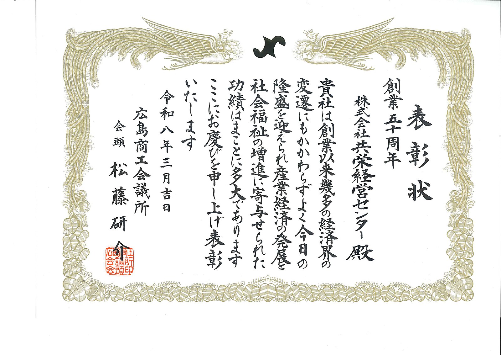 この度共栄経営センターは、3月に創業50周年の節目を迎え、広島商工会議所より「創業・開設永年継続企業表彰」として表彰いただきました。
